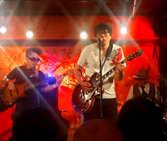 朧月・夜(歌とギター)、コハ・ラ・スマート(ハーモニカ)、大久保チャイル(ベース)のトリオ編成でお届けしたブルースバンドすしライブ@東高円寺U.F.O.CLUB。この日は、ポール岡田グループ、マリアンヌ東雲とエロチカ・トリオ、ギャランティーク和恵、ザ・トランプの方々が、寄ってたかって日本製のニューロックやニュー歌謡を大炸裂!そんな中、すしの三人は3つのコードしか使わない簡単な仕組みの音楽”ブルース”を過剰なテンションでプレイ。あっけにとられるお客様をよそに、飛んだりハネたり回ってみたりと大はしゃぎのステージングを披露。楽しいムードが少し伝わって、お集まりのお客様には喜んでいただけたようだった。みなさま、ご来場いただき誠にありがとうございました!