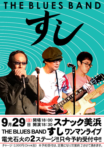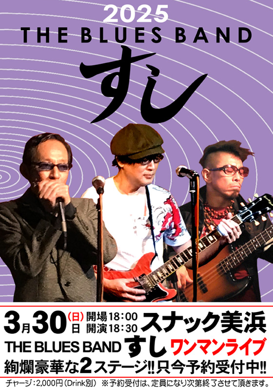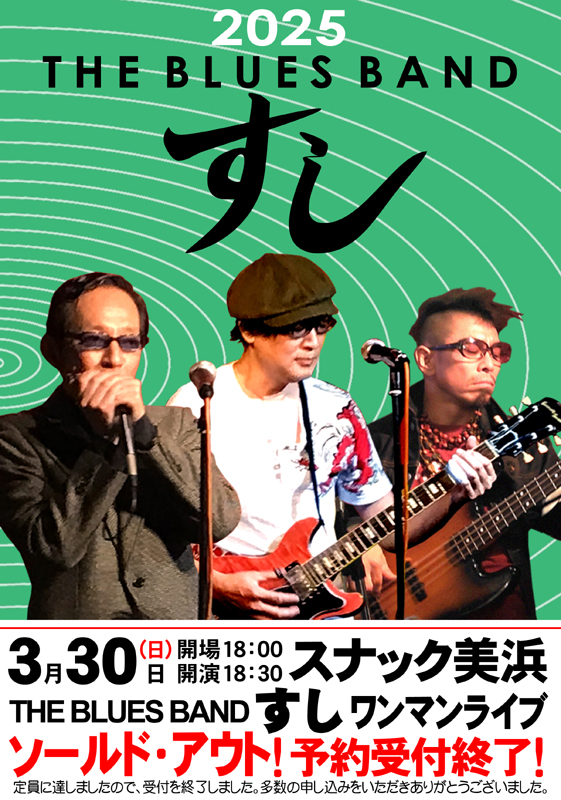 3/30(日)【THE BLUES BAND すし ワンマン・ライブ@スナック美浜】は、定員に達しましたので予約受付を終了しました。 多数の申し込みをいただきありがとうございました!