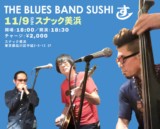 品川区中延にある『スナック美浜』にて、トリオ編成のブルースバンドすしライブ開催!